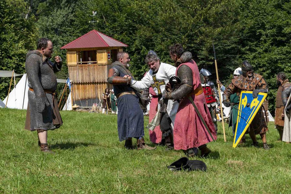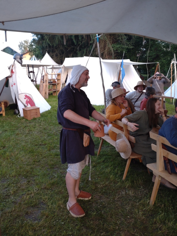 Höhepunkt für die Gäste wie auch für die Lagerleute war dabei natürlich die Feldschlacht, die dieses Jahr in Form eines historischen Buhurts stattfand. Nach einigen Anläufen gelang es dem Haufen um Werinhardt von Julbach tatsächlich den Reinherr von Wehenöd gefangen zu nehmen.